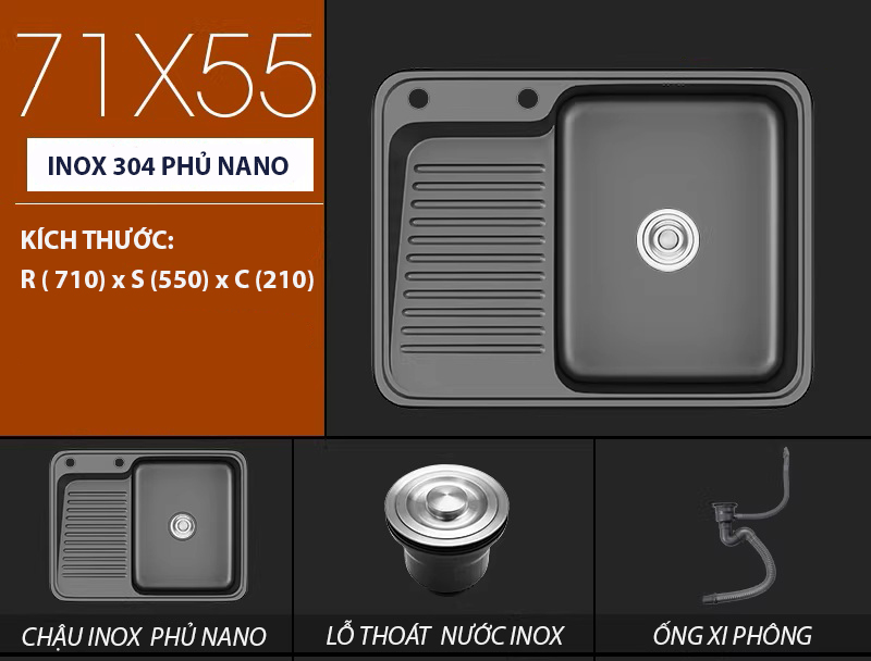 - Màu sắc: Inox mờ, bao gồm kèm bộ xi phông, 02 lỗ thoát