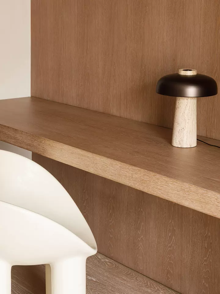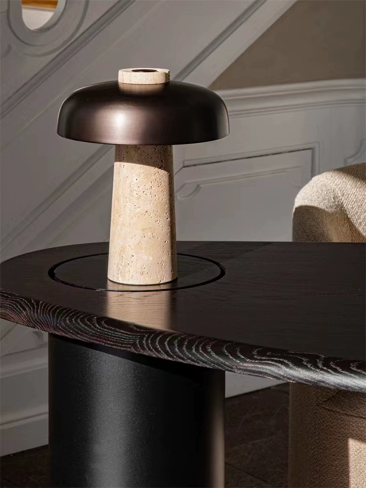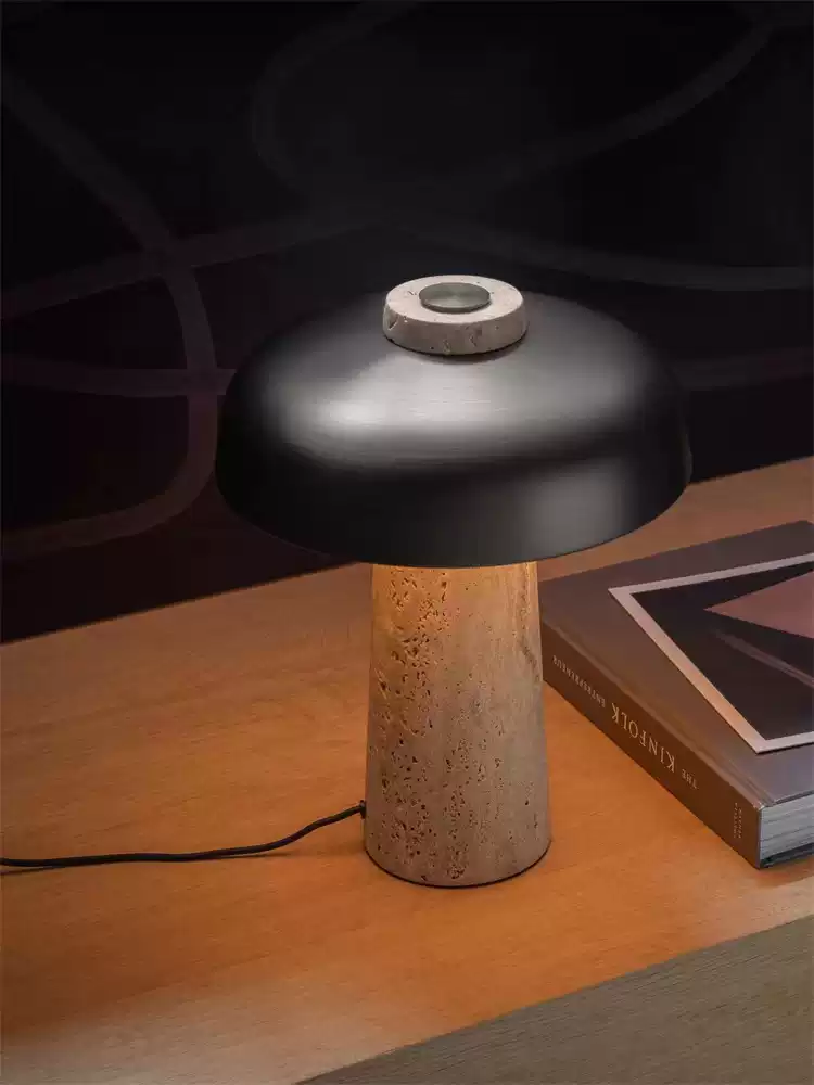 Đèn bàn vân đá Travertine, chao đèn có 2 màu sắc Trắng/ Đen dễ phối với nhiều phong cách và không gian khác nhau;