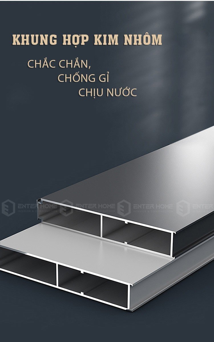 Tủ bảo vệ máy giặt được làm bằng hợp kim nhôm và đá nhân tạo đúc liền khối mang đến nhiều ưu điểm vượt trội. Hợp kim nhôm là vật liệu nhẹ, nhưng đồng thời cũng rất chắc chắn và bền bỉ. Với tính chất chống oxi hóa và chống ăn mòn, hợp kim nhôm giúp tủ bảo vệ máy giặt tránh được sự tác động của môi trường, như sự ảnh hưởng của nước, hơi ẩm, và hóa chất trong quá trình giặt. Hợp kim nhôm cũng giúp tủ có độ bóng và vẻ ngoài mỹ quan, tạo điểm nhấn cho không gian sử dụng.
