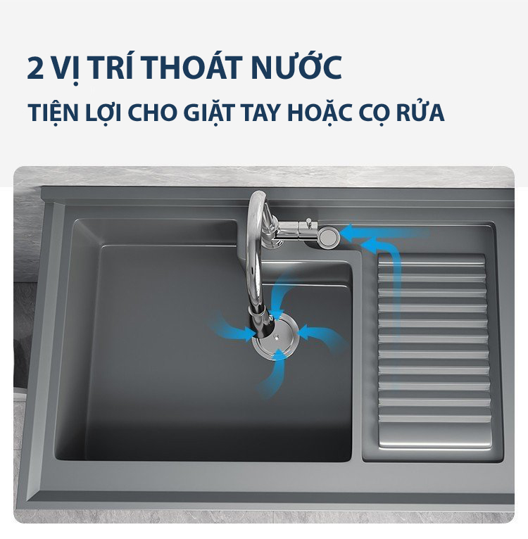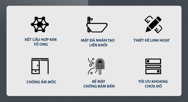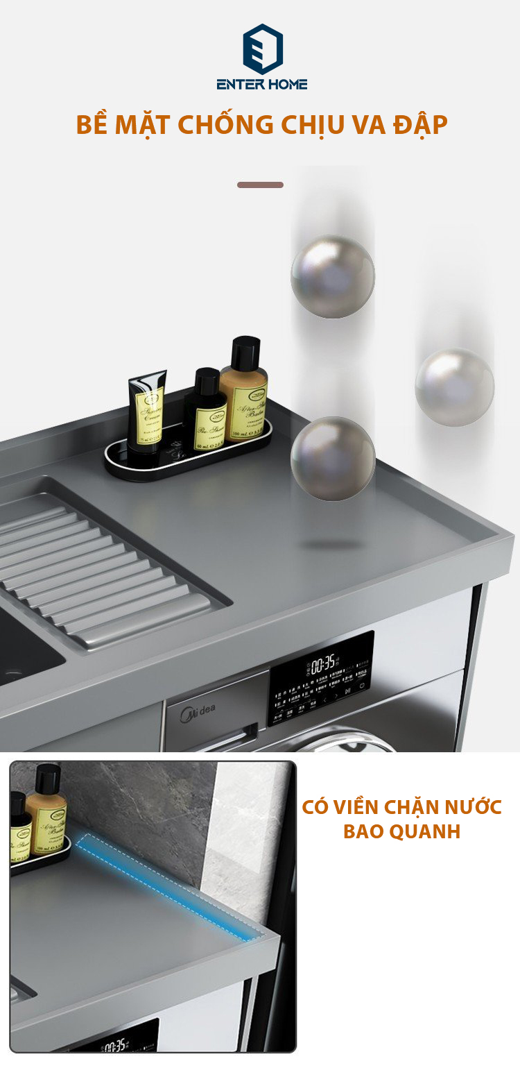 - Mặt bàn chậu giặt: Đá nhân tạo đúc liền khối - Thiết kế chắc chắn, đảm bảo độ cứng, chống bám bẩn, ẩm mốc, dễ vệ sinh;